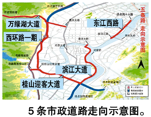 据了解,万绿湖大道等5条市政道路均按一级公路兼城市I级主干道标准建设,双向6车道,其中万绿湖大道全长6.224公里;桂山迎客大道规划建设全长4.2公里,分二期建设;河源市区过境公路(西环路)规划建设全长38.2公里,分二期建设;滨江大道总长度约6公里,工程分三个标段建设;东江西路总长约3.16公里,上述5条市政道路争取在明年秋冬期间全面建成通车。