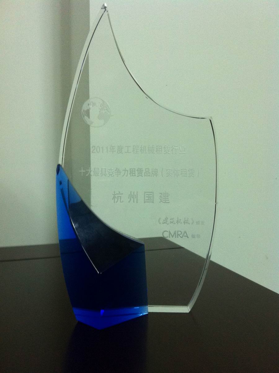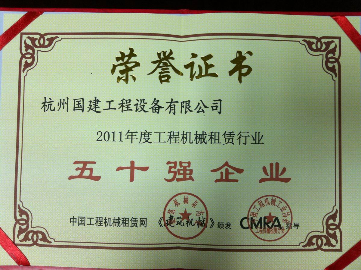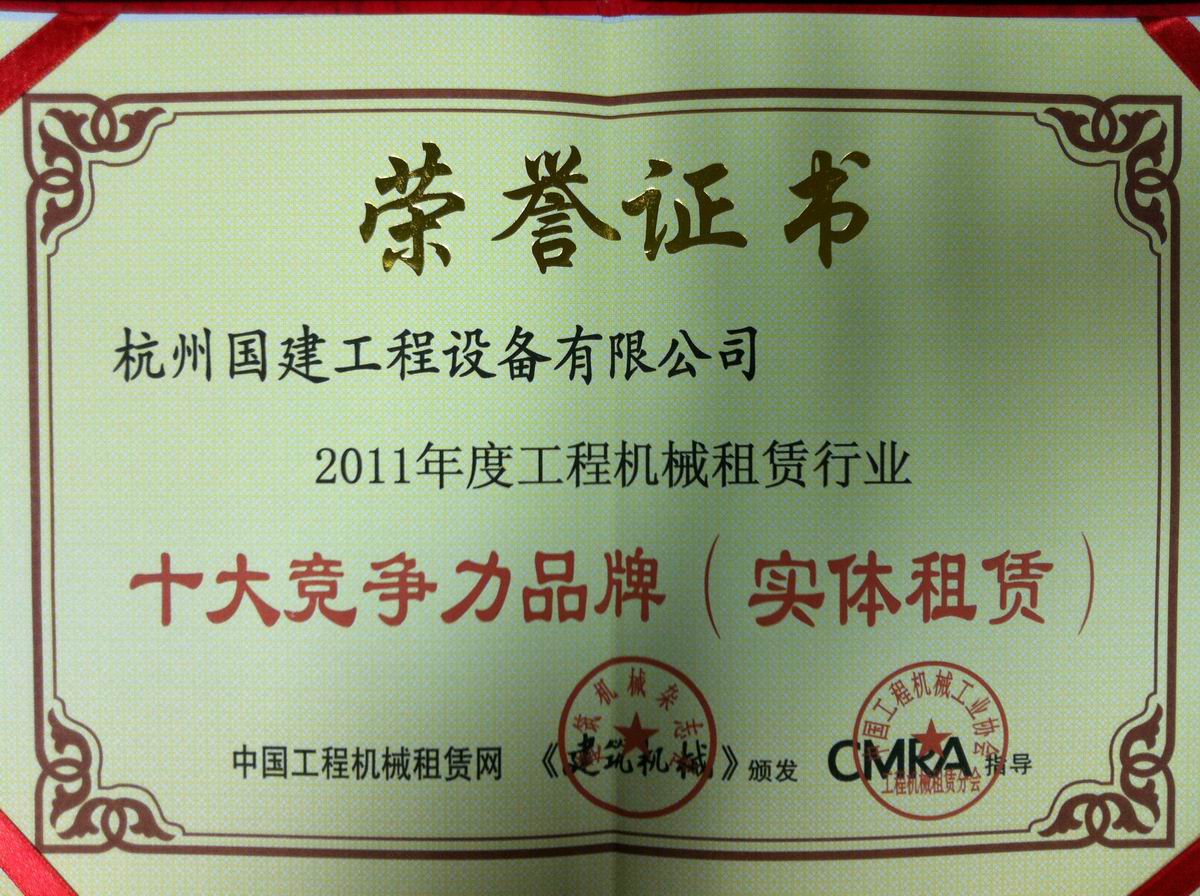 在租赁部工作人员的努力和公司其他部门的积极帮助下,经过了近半年多的评选,由中国工程机械工业协会工程机械租赁分会主办的中国工程机械租赁业颁奖庆典上,杭州国建工程设备有限公司荣获2011年度工程机械租赁行业“50强企业”和“十大最具竞争力租赁品牌”;