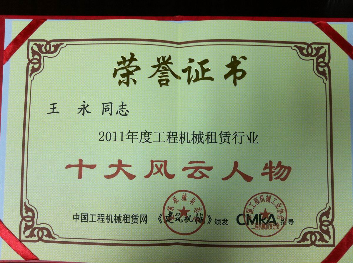 同时,总经理王永先生众望所归被评为2011年度工程机械租赁行业“十大风云人物”。
